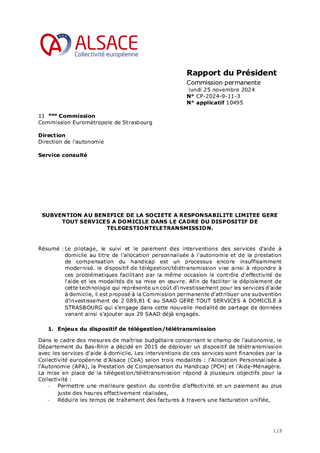 Le pilotage, le suivi et le paiement des interventions des services d'aide à domicile au titre de l'allocation personnalisée à l'autonomie et de la prestation de compensation du handicap est un processus encore insuffisamment modernisé. le dispositif de télégestion/télétransmission vise ainsi à répondre à ces problématiques facilitant par la même occasion le contrôle d'effectivité de l'aide et les modalités de sa mise en œuvre. Afin de faciliter le déploiement de cette technologie qui représente un coût d'investissement pour les services d'aide à domicile, il est proposé à la Commission permanente d’attribuer une subvention d’investissement de 2 089,81 € au SAAD GERE TOUT SERVICES A DOMICILE à STRASBOURG qui s’engage dans cette nouvelle modalité de partage de données venant ainsi s'ajouter aux 29 SAAD déjà engagés.
