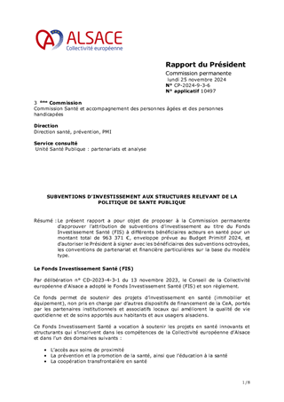 Le présent rapport a pour objet de proposer à la Commission permanente d'approuver l'attribution de subventions d'investissement au titre du Fonds Investissement Santé (FIS) à différents bénéficiaires acteurs en santé pour un montant total de 963 371 €, enveloppe prévue au Budget Primitif 2024, et d'autoriser le Président à signer avec les bénéficiaires des subventions octroyées, les conventions de partenariat et financière particulières sur la base du modèle type.