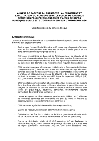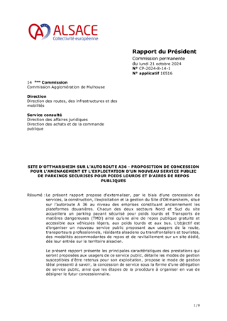 Le présent rapport propose d’externaliser, par le biais d’une concession de services, la construction, l’exploitation et la gestion du Site d’Ottmarsheim, situé sur l’autoroute A 36 au niveau des emprises constituant anciennement les plateformes douanières. Chacun des deux secteurs Nord et Sud du site accueillera un parking payant sécurisé pour poids lourds et Transports de matières dangereuses (TMD) ainsi qu’une aire de repos publique gratuite et accessible aux véhicules légers, aux poids lourds et aux bus. L’objectif est d’organiser un nouveau service public proposant aux usagers de la route, transporteurs professionnels, résidants alsaciens ou transfrontaliers et touristes, des modalités accommodantes de repos et de ravitaillement sur un site dédié, dès leur entrée sur le territoire alsacien. Le présent rapport présente les principales caractéristiques des prestations qui seront proposées aux usagers de ce service public, détaille les modes de gestion susceptibles d’être retenus pour son exploitation, propose le mode de gestion idéal pressenti à savoir, la concession de service sous la forme d'une délégation de service public, ainsi que les étapes de la procédure à organiser en vue de désigner le futur concessionnaire.