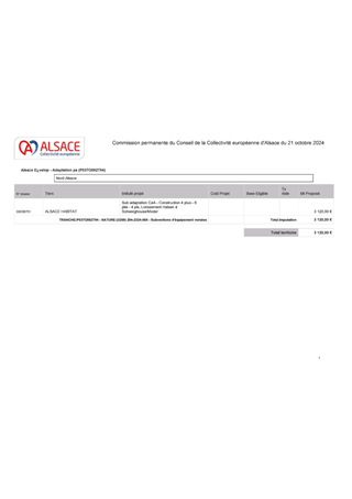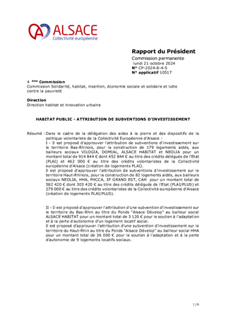 Dans le cadre de la délégation des aides à la pierre et des dispositifs de la politique volontariste de la Collectivité Européenne d'Alsace : I - Il est proposé d'approuver l'attribution de subventions d'investissement sur le territoire Bas-Rhinois, pour la construction de 179 logements aidés, aux bailleurs sociaux VILOGIA, DOMIAL, ALSACE HABITAT et NEOLIA pour un montant total de 914 844 € dont 452 844 € au titre des crédits délégués de l'Etat (PLAI) et 462 000 € au titre des crédits volontaristes de la Collectivité européenne d'Alsace (création de logements PLAI). Il est proposé d'approuver l'attribution de subventions d'investissement sur le territoire Haut-Rhinois, pour la construction de 82 logements aidés, aux bailleurs sociaux NEOLIA, HHA, PHCCA, 3F GRAND EST, CAH pour un montant total de 582 420 € dont 303 420 € au titre des crédits délégués de l'Etat (PLAI/PLUS) et 279 000 € au titre des crédits volontaristes de la Collectivité européenne d'Alsace (création de logements PLAI/PLUS). II - Il est proposé d'approuver l'attribution d’une subvention d'investissement sur le territoire du Bas-Rhin au titre du Fonds "Alsace Dévelop" au bailleur social ALSACE HABITAT pour un montant total de 3 120 € pour le soutien à l'adaptation et à la perte d'autonomie d’un logement locatif social. Il est proposé d'approuver l'attribution d’une subvention d'investissement sur le territoire du Haut-Rhin au titre du Fonds "Alsace Dévelop" au bailleur social HHA pour un montant total de 36 000 € pour le soutien à l'adaptation et à la perte d'autonomie de 9 logements locatifs sociaux.