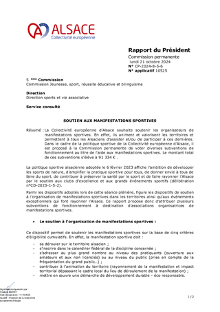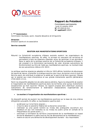 La Collectivité européenne d’Alsace souhaite soutenir les organisateurs de manifestations sportives. En effet, ils animent et valorisent les territoires et permettent à tous les Alsaciens d’assister et/ou de participer à ces dernières. Dans le cadre de la politique sportive de la Collectivité européenne d'Alsace, il est proposé à la Commission permanente de voter diverses subventions de fonctionnement au titre de l'aide aux manifestations sportives. Le montant total de ces subventions s’élève à 91 334 € .