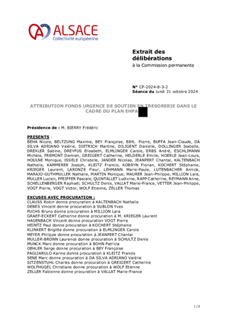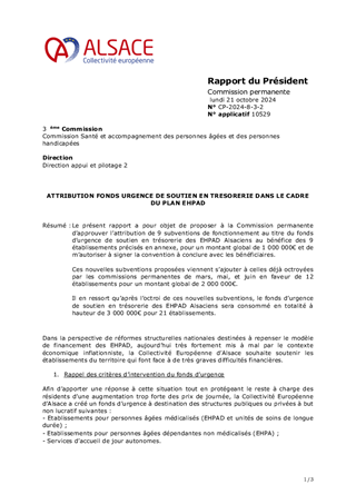 Le présent rapport a pour objet de proposer à la Commission permanente d’approuver l’attribution de 9 subventions de fonctionnement au titre du fonds d’urgence de soutien en trésorerie des EHPAD Alsaciens au bénéfice des 9 établissements précisés en annexe, pour un montant global de 1 000 000€ et de m’autoriser à signer la convention à conclure avec les bénéficiaires. Ces nouvelles subventions proposées viennent s’ajouter à celles déjà octroyées par les commissions permanentes de mars, mai, et juin en faveur de 12 établissements pour un montant global de 2 000 000€. Il en ressort qu’après l’octroi de ces nouvelles subventions, le fonds d’urgence de soutien en trésorerie des EHPAD Alsaciens sera consommé en totalité à hauteur de 3 000 000€ pour 21 établissements.