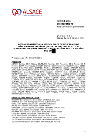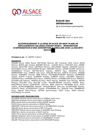 Dans le cadre du dispositif des Certificats d'Économie d'Énergie (CEE), le Ministère de la Transition Écologique et Solidaire a labellisé la société Eco CO2 afin d'accompagner la mise en place de Plans de Déplacements dans les établissements scolaires. Un Plan de Déplacements Collège vise à repenser les trajets domicile - collège pour les élèves et par rebond pour l'ensemble des acteurs impliqués dans la vie de l'établissement (enseignants, parents d'élèves, personnel technique). In fine, ces démarches visent à modifier les comportements pour évoluer vers des habitudes de déplacement plus sobres, plus sûres et adaptées aux enjeux de santé publique. Le présent rapport abroge la délibération votée par la Commission permanente du Conseil Départemental du Bas-Rhin du 30 novembre 2020. En effet, compte-tenu de la COVID et des retards dans la mise en place du programme, il est proposé d'élargir le programme MOBY à l'ensemble du territoire de la Collectivité européenne d'Alsace pour un démarrage à partir de la rentrée scolaire 2021-2022. Neuf collèges ont été identifiés pour démarrer le programme MOBY et bénéficier d'un accompagnement sur une durée de deux années scolaires : Hans Arp à Strasbourg, Wasselonne, Val de Moder, Barr, Torenberg-Heiligenstein, Châtenois, Soultz, Marcel Pagnol à Wittenheim et Ferrette.