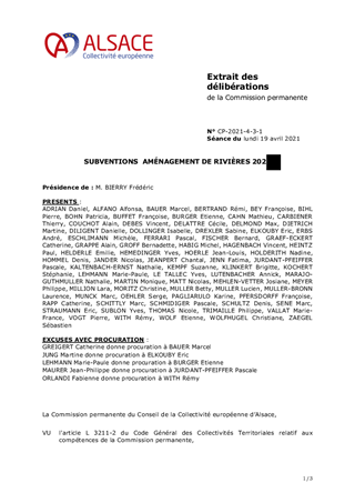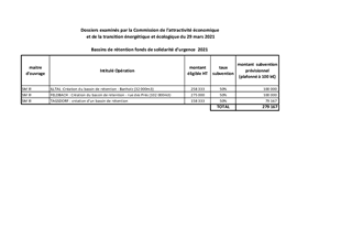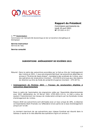 Dans le cadre des subventions accordées par la CeA au titre de l’aménagement des rivières en 2021, il vous est proposé d’attribuer les subventions détaillées en annexe à "Rivières de Haute Alsace", mandataire des syndicats de rivières, pour des opérations de renaturation (montant : 214 833 €) ainsi que pour des bassins de rétention au titre du fonds de solidarité d'urgence (montant : 279 167 €).