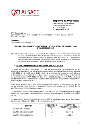 Le présent rapport a pour objet de proposer à la Commission permanente d'approuver l'attribution de subventions d'investissement au titre du Fonds de Solidarité Territoriale (FST) pour un montant total de 1 066 134 €, d'approuver des conventions financières, de changer l'objet d'une subvention et d'autoriser un don par une association ayant bénéficié d'une subvention.