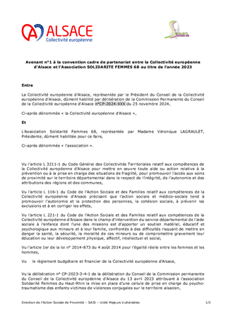 Par délibération du 13 avril 2023, rapport N° CP-2023-3-4-1, l’association SOLIDARITE FEMMES 68 a été retenue comme porteur du projet pour organiser, à l’échelon alsacien, le dispositif de prise en charge du psycho-traumatisme des enfants exposés/victimes de violences conjugales graves ou impactés suite à un homicide au sein du couple parental. Le présent rapport a pour objet de modifier la durée d’exécution de la convention cadre de partenariat avec SOLIDARITE FEMMES 68, prévue initialement du 1er mai 2023 au 31 décembre 2024, pour la compléter d’une durée de 3 mois supplémentaires, soit du 1er janvier 2025 au 31 mars 2025 par voie d’avenant. Cette période supplémentaire permettra de dresser un bilan sur une année pleine d’organisation et de mesurer les effets de cette nouvelle offre de service pour décider de sa poursuite. La signature de cet avenant n’a pas d’incidence financière.