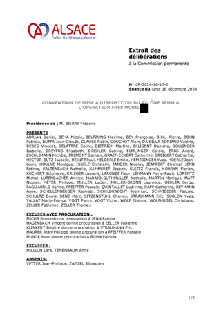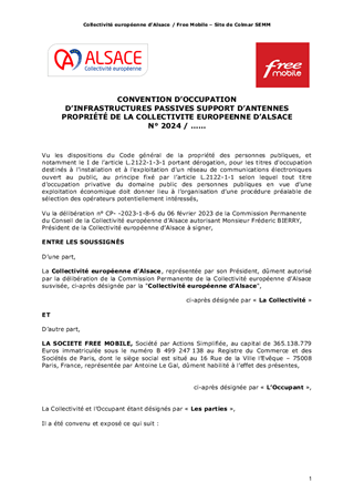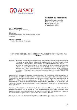 Le présent rapport a pour objet d'approuver la mise à disposition d'une partie du pylône du carrefour Semm à Colmar à l'opérateur Free Mobile afin qu'il puisse installer ses antennes dans le cadre de la couverture en téléphonie mobile. Le projet de convention présenté à l'approbation de la Commission permanente prévoit une occupation d'une durée initiale de 10 ans, puis reconductible par périodes de 3 ans, en contrepartie du versement annuel à la Collectivité européenne d'Alsace d'une redevance d'occupation d'un montant de 7 800 € TTC révisable.