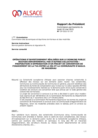 La Collectivité européenne d'Alsace peut autoriser d’autres collectivités à effectuer des travaux sur son domaine public routier. Ces collectivités, Communes ou Communautés de Communes en général, peuvent bénéficier des attributions du fonds de compensation pour la taxe sur la valeur ajoutée (FCTVA) pour les investissements réalisés sur le domaine public d’une autre collectivité à condition de conclure une convention telle que prévue par le Code général des collectivités territoriales. Le projet de convention à conclure à ce titre a été établi à partir d’un modèle-type approuvé par délibération de la Commission Permanente du Département du Bas-Rhin du 7 novembre 2011 (n° CP/2011/825). Il est proposé à la Commission Permanente d'approuver les termes du projet de convention de financement à conclure avec la Communauté d’Agglomération de Haguenau, selon les modalités précisées dans le tableau joint en annexe au présent rapport.