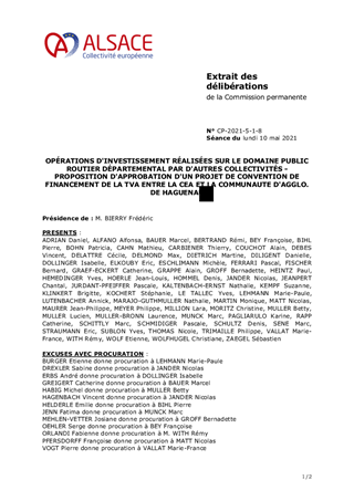 OPÉRATIONS D'INVESTISSEMENT RÉALISÉES SUR LE DOMAINE PUBLIC ROUTIER DÉPARTEMENTAL PAR D'AUTRES COLLECTIVITÉS - PROPOSITION D'APPROBATION D'UN PROJET DE CONVENTION DE FINANCEMENT DE LA TVA ENTRE LA CEA ET LA COMMUNAUTE D'AGGLO. DE HAGUENAU