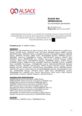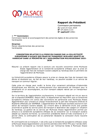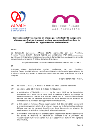 CONVENTION RELATIVE À LA PRISE EN CHARGE PAR LA COLLECTIVITÉ EUROPÉENNE D'ALSACE DES FRAIS DE TRANSPORT SCOLAIRE ADAPTÉ AU HANDICAP DANS LE PÉRIMÈTRE DE L'AGGLOMÉRATION MULHOUSIENNE 2025-2030