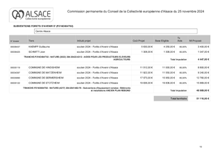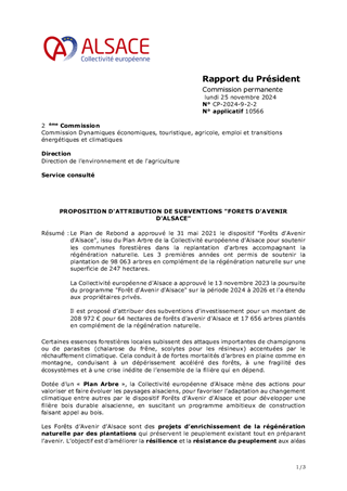 Le Plan de Rebond a approuvé le 31 mai 2021 le dispositif "Forêts d'Avenir d'Alsace", issu du Plan Arbre de la Collectivité européenne d’Alsace pour soutenir les communes forestières dans la replantation d'arbres accompagnant la régénération naturelle. Les 3 premières années ont permis de soutenir la plantation de 98 063 arbres en complément de la régénération naturelle sur une superficie de 247 hectares. La Collectivité européenne d'Alsace a approuvé le 13 novembre 2023 la poursuite du programme "Forêt d'Avenir d'Alsace" sur la période 2024 à 2026 et l'a étendu aux propriétaires privés. Il est proposé d’attribuer des subventions d'investissement pour un montant de 208 972 € pour 64 hectares de forêts d'avenir d'Alsace et 17 656 arbres plantés en complément de la régénération naturelle.