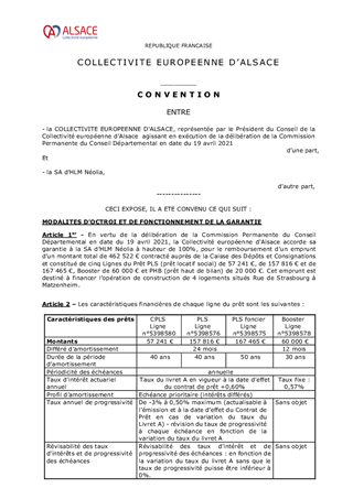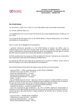 Le présent rapport propose à la Commission permanente de décider d’accorder une garantie d’emprunt pour un prêt souscrit par la SA d’HLM Néolia pour une opération de construction de logements PLS situés à Matzenheim.