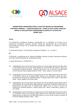 Dans le cadre de la convention de suivi-animation entre le Département du Haut Rhin, CITIVIA SPL et PROCIVIS Alsace pour la mise en œuvre du Programme d’Intérêt Général « Habiter Mieux 68 » sur la période 2018/2023, il vous est proposé d’approuver la convention financière établie pour l’année 2021 entre la Collectivité européenne d’Alsace et CITIVIA SPL, en charge de l’accompagnement des ménages. La commission en charge de l’insertion, de l’habitat et de la lutte contre la pauvreté a exprimé un avis favorable en date du 26 mars 2021.