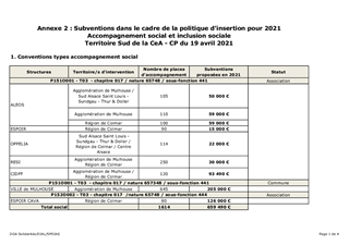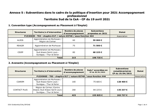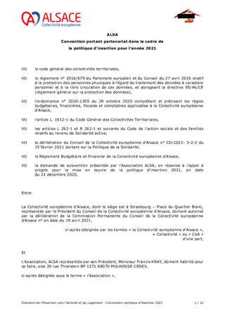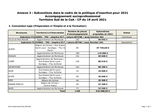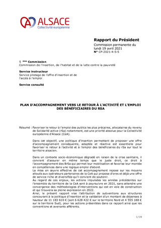 Favoriser le retour à l’emploi des publics les plus précaires, allocataires du revenu de Solidarité active (rSa) notamment, est une priorité absolue pour la Collectivité européenne d’Alsace (CeA). Dans cet objectif, une politique d’insertion permettant de proposer une offre d’accompagnement conséquente, adaptée et réactive est essentielle pour favoriser le retour à l’activité et à l’emploi des bénéficiaires du rSa sur tout le territoire alsacien. Dans un contexte socio-économique dégradé en raison de la crise sanitaire, il convient d’assurer en même temps que le juste droit, ce droit à l’accompagnement des BrSa qui permet leur mobilisation et favorise leur montée en compétences dans une logique emploi d’abord. La mise en œuvre effective de cet accompagnement repose sur les moyens alloués aux opérateurs partenaires de la CeA qui propose d’ores et déjà une offre de service riche et diversifiée qu’il convient de soutenir. Au regard de ces enjeux, les actions impulsées les années précédentes sur l’ensemble du territoire de la CeA sont à poursuivre en 2021, sans attendre une convergence des méthodologies d’interventions qui est en voie de construction et qui trouvera sa pleine expression en 2022. Ainsi, le présent rapport vise l’attribution de subventions aux structures concourant à la politique d’insertion et la validation d’un montant de dépenses à hauteur de 11 183 610 € (soit 6 628 422 € sur le territoire Nord et 4 555 188 € sur le territoire Sud), pour les actions présentées dans ce rapport ainsi que les conventions et avenants afférents. Une adaptation des ressources sera éventuellement à envisager ultérieurement au regard de l’augmentation du nombre de bénéficiaires du rSa et d’une analyse plus fine des besoins à l’échelle de chaque territoire.