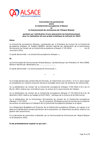 Les orientations renouvelées pour la culture et le rayonnement de l’Alsace, dont s’est dotée la Collectivité européenne d’Alsace le 21 février 2022, ont pour ambition d’incarner l’Alsace en soutenant la présence artistique sur son territoire et les dynamiques partenariales qui favorisent la cohésion sociale et territoriale. Dans ce cadre, le présent rapport a pour objet de proposer à la Commission permanente d'attribuer des subventions en fonctionnement (153 000 €) au titre de projets de développement culturel de 6 Communautés de Communes (Alsace Bossue, Hanau La Petite Pierre, Pays de la Zorn, Val d'argent, Thann-Cernay, Sundgau) et d'une commune (Ville de Mulhouse).