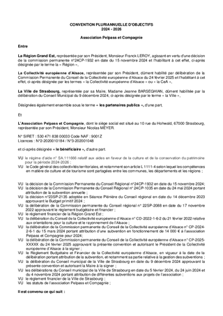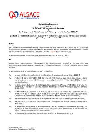 Ce rapport a pour objectif de soumettre au vote des conseillers d'Alsace des conventions pluriannuelles d'objectifs avec deux acteurs culturels, l'espace Django et l'association Pelpass à Strasbourg, ainsi que l'attribution de la subvention de fonctionnement d'un montant de 46 000 € pour l'année 2025 pour le Groupement d'Employeurs de l'Enseignement Musical. Il est également proposé à la Commission permanente d'approuver le versement d'un acompte de 250 000€ sur la contribution statutaire de fonctionnement 2025 à Archéologie Alsace.