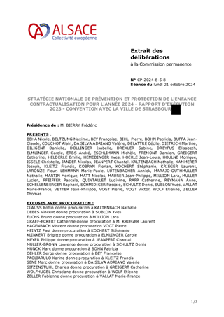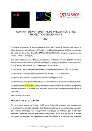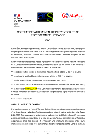 La mise en œuvre de la Stratégie nationale de prévention et de protection de l’enfance 2020-2023 dans le cadre de contrats locaux tripartites (préfet, agence régionale de santé, département) engagée en 2020, a permis d’impulser et de développer des actions concrètes pour renforcer l’accès à la prévention en santé de tous les enfants alsaciens, améliorer la situation des enfants protégés et produire une meilleure convergence des réponses à leurs besoins dans les territoires. Cette démarche de contractualisation en prévention et protection de l’enfance s’est poursuivie en 2024 sous la forme d’un exercice de transition avant une évolution des modalités de la contractualisation à compter de 2025. Par ailleurs, afin que la CeA puisse atteindre les objectifs posés par ce contrat sur le périmètre de l’Eurométropole de Strasbourg et eu égard à l’existence de la délégation sociale conférée à la Ville de Strasbourg, il convient de contractualiser avec la ville de Strasbourg pour qu’elle puisse percevoir les recettes qui lui permettront de recruter les professionnels nécessaires à la mise en œuvre de la stratégie de prévention et de protection de l’enfance, soit 350 000 € pour 2024. Enfin, l’engagement dans des contrats départementaux de prévention et de protection de l’enfance suppose de produire chaque année des bilans d’exécution. Ce rapport vous présente ceux qui concernent l’année 2023.
