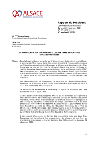 Impulsée par le Gouvernement à partir d’expériences de terrain et co-pilotée par le secrétariat d’Etat chargé de la Citoyenneté et la Ville à l’époque et le ministère de l’Education nationale et de la Jeunesse, la démarche de labellisation des Cités éducatives est née en 2019 de la nécessité d’avoir une action renforcée en matière éducative dans les quartiers prioritaires de la politique de la ville (QPV) avec un engagement : soutenir les alliances éducatives à établir collectivement une stratégie sur le territoire pour garantir l’égalité des chances et l’émancipation de chaque jeune en lien avec la mobilisation nationale pour les habitants des quartiers. Sur l’Eurométropole de Strasbourg, le territoire du Neuhof-Meinau-Elsau-Montagne de Strasbourg a déjà l’objet d’une première labellisation de 2020 à 2022 puis renouvelée pour 2023/2024. Le territoire de Hautepierre à Strasbourg a rejoint le dispositif des Cités Educatives en 2021 pour 3 ans. L’action de la Collectivité Européenne d’Alsace est fondamentale sur le périmètre des Cités éducatives de Strasbourg au côté des collèges en Réseau d’Education Prioritaire, entre autres, avec la création par exemple du nouveau collège sur le site Lyautey au Neuhof ou la rénovation du collège Lezay Marnésia. Il est donc proposé que la Collectivité Européenne d’Alsace intègre la gouvernance de ces Cités Educatives au côté de l’Etat, de l’Education Nationale, de la Ville de Strasbourg et de l’Eurométropole de Strasbourg dans le cadre du renouvellement des conventions cadre pluriannuelles des deux Cités Educatives avec l’intégration du territoire de Cronenbourg dans la Cité Educative de Hautepierre. Il est proposé d’approuver les termes des conventions cadre des deux Cités Educatives qui formalisent les engagements de chacun, et qui fixe les orientations stratégiques et le plan d’actions des Cités éducatives jusqu’au 31 décembre 2026.