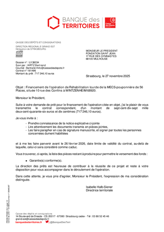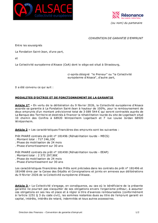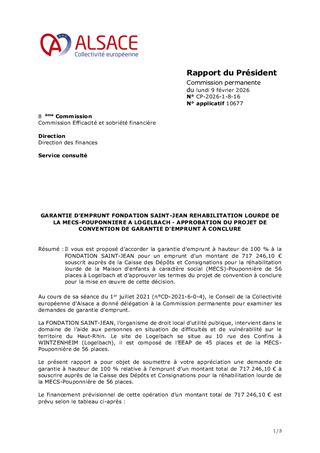 Il vous est proposé d’accorder la garantie d'emprunt à hauteur de 100 % à la FONDATION SAINT-JEAN pour un emprunt d’un montant de 717 246,10 € souscrit auprès de la Caisse des Dépôts et Consignations pour la réhabilitation lourde de la Maison d'enfants à caractère social (MECS)-Pouponnière de 56 places à Logelbach et d’approuver les termes du projet de convention à conclure pour la mise en œuvre de cette décision.