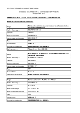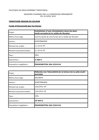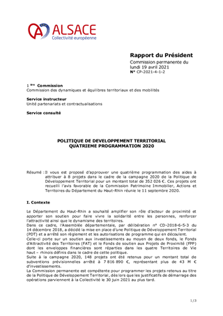Il vous est proposé d’approuver une quatrième programmation des aides à attribuer à 8 projets dans le cadre de la campagne 2020 de la Politique de Développement Territorial pour un montant total de 352 026 €. Ces projets ont recueilli l’avis favorable de la Commission Patrimoine Immobilier, Actions et Territoires du Département du Haut-Rhin réunie le 11 septembre 2020.