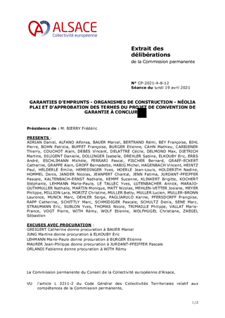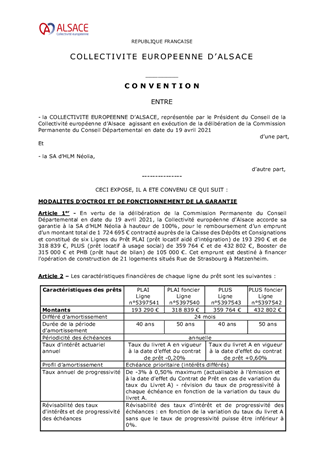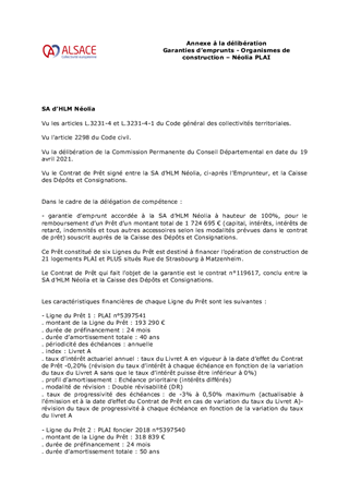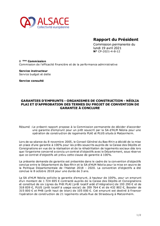 Le présent rapport propose à la Commission permanente de décider d’accorder une garantie d’emprunt pour un prêt souscrit par la SA d’HLM Néolia pour une opération de construction de logements PLAI et PLUS situés à Matzenheim.