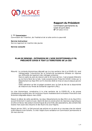 Le contexte économique dégradé par la crise sanitaire liée à la COVID-19, rend indispensable l'intervention de la Collectivité européenne d’Alsace en réponse aux difficultés de logement des ménages précaires. Dans le cadre du plan de rebond voté le 26 mars dernier, il est proposé d’étendre au territoire Nord de la CeA, l'aide exceptionnelle Précarité COVID initiée par le Département du Haut-Rhin en fin d’année 2020 et mise en oeuvre depuis janvier 2021. Cette opération se fait à budget constant pour la CeA du fait de la disponibilité de trésorerie du Fonds de Solidarité Logement (FSL).