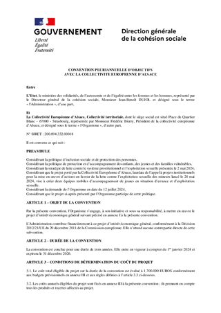 Les objectifs de la politique de la Collectivité européenne d'Alsace en faveur des jeunes en situation d’errance et de prostitution confiés à l’aide sociale à l’enfance visent à accompagner ces derniers de manière inconditionnelle en proposant un dispositif d’accompagnement de 40 places par redéploiement de moyens. Ce dispositif innovant a été reconnu lauréat dans le cadre d’un appel à projet lancé cet été par l’Etat et a obtenu une subvention de 600 000 €. Il est proposé à la Commission Permanente d’approuver la convention de partenariat qui lie la collectivité à l’Etat pour la période du 1er janvier 2024 et jusqu’au 31 décembre 2026.