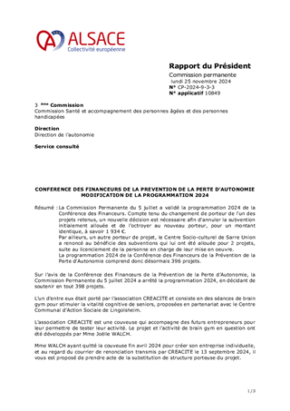 La Commission Permanente du 5 juillet a validé la programmation 2024 de la Conférence des Financeurs. Compte tenu du changement de porteur de l'un des projets retenus, un nouvelle décision est nécessaire afin d'annuler la subvention initialement allouée et de l'octroyer au nouveau porteur, pour un montant identique, à savoir 1 934 €. Par ailleurs, un autre porteur de projet, le Centre Socio-culturel de Sarre Union a renoncé au bénéficie des subventions qui lui ont été allouée pour 2 projets, suite au licenciement de la personne en charge de leur mise en oeuvre. La programmation 2024 de la Conférence des Financeurs de la Prévention de la Perte d'Autonomie comprend donc désormais 396 projets.