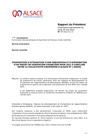 Le présent rapport propose à la Commission Permanente d’approuver le projet de programme de travail partenarial 2021 de l'Agence de développement et d'urbanisme de l'agglomération strasbourgeoise (ADEUS), et afin de mettre ce programme en œuvre, de lui attribuer une subvention de 312 000 € pour l'année 2021. Il est également proposé d'approuver les termes du projet de convention financière à conclure entre la Collectivité européenne d’Alsace et l'ADEUS pour l’année 2021.