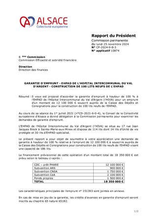 Il vous est proposé d’accorder la garantie d'emprunt à hauteur de 100 % à l’EHPAD de l’Hôpital Intercommunal du Val d’Argent (l’HIVA) pour un emprunt d’un montant de 12 100 000 € souscrit auprès de la Caisse des Dépôts et Consignations pour la construction de 100 lits neufs de l’EHPAD.