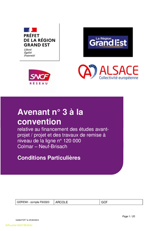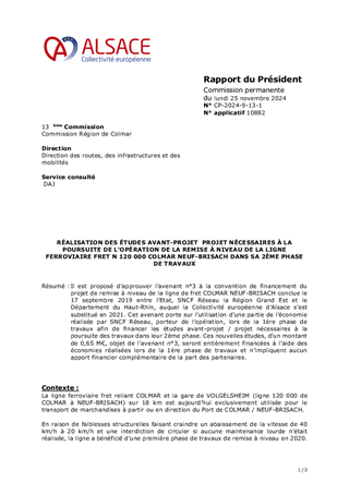 Il est proposé d’approuver l’avenant n°3 à la convention de financement du projet de remise à niveau de la ligne de fret COLMAR NEUF-BRISACH conclue le 17 septembre 2019 entre l’Etat, SNCF Réseau la Région Grand Est et le Département du Haut-Rhin, auquel la Collectivité européenne d’Alsace s’est substitué en 2021. Cet avenant porte sur l’utilisation d’une partie de l’économie réalisée par SNCF Réseau, porteur de l’opération, lors de la 1ère phase de travaux afin de financer les études avant-projet / projet nécessaires à la poursuite des travaux dans leur 2ème phase. Ces nouvelles études, d’un montant de 0,65 M€, objet de l’avenant n°3, seront entièrement financées à l’aide des économies réalisées lors de la 1ère phase de travaux et n’impliquent aucun apport financier complémentaire de la part des partenaires.