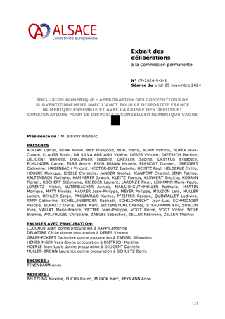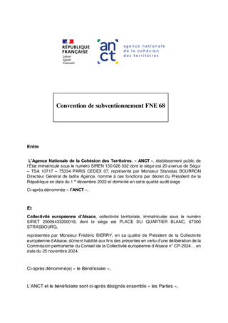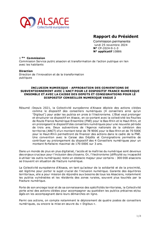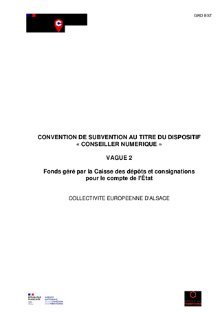 Depuis 2021, la Collectivité européenne d'Alsace déploie des actions ciblées comme le dispositif des conseillers numériques (4 conseillers ainsi qu'un "Digibus") pour aider les publics en proie à l'illectronisme. L'Etat veut prolonger et structurer ce dispositif en Alsace, en co-portant avec la collectivité les Feuilles de Route France Numérique Ensemble (FNE) pour le Bas-Rhin et le Haut-Rhin, et en prolongeant le dispositif des conseillers numériques pour une nouvelle période de trois ans. Deux subventions de l'Agence nationale de la cohésion des territoires (ANCT) d'un montant total de 78 900€ pour le Bas-Rhin et de 70 500€ pour le Haut-Rhin permettront de financer des actions dans le cadre de la FNE. Une convention avec la Caisse des Dépôts et Consignations permettra de contribuer au prolongement du dispositif des 4 Conseillers numériques pour un montant forfaitaire maximal de 170 000€ sur 3 ans.