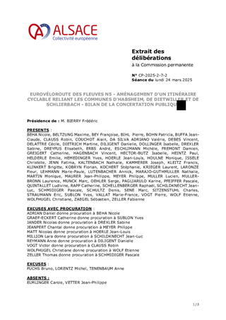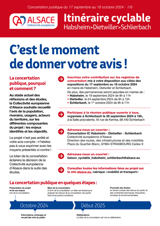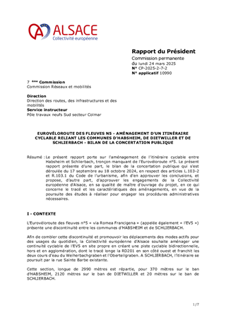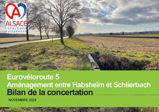 Le présent rapport porte sur l'aménagement de l'itinéraire cyclable entre Habsheim et Schlierbach, tronçon manquant de l'Eurovéloroute n°5. Le présent rapport présente d’une part, le bilan de la concertation publique qui s'est déroulée du 17 septembre au 18 octobre 2024, en respect des articles L.103-2 et R.103.1 du Code de l’urbanisme, afin d'en approuver les conclusions, et propose, d’autre part, d'approuver les engagements de la Collectivité européenne d'Alsace, en sa qualité de maître d'ouvrage du projet, en ce qui concerne le tracé et les caractéristiques des aménagements, en vue de la poursuite des études à réaliser pour engager les procédures administratives nécessaires.