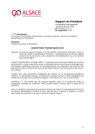 Le présent rapport propose à la Commission permanente d’attribuer, dans le cadre de l’Appel à Manifestation d’Intérêt « investissements territoriaux dédiés au tourisme de proximité », des subventions d’investissement pour un montant total de 483 089 €.