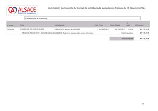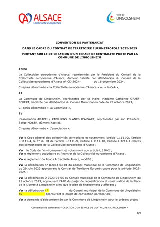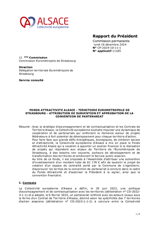 Avec la stratégie d’accompagnement et de contractualisation et les Contrats de Territoire Alsace, la Collectivité européenne souhaite impulser une dynamique de coopération et de partenariats qui renforcent la résilience autour de projets fédérateurs à fort potentiel de développement pour chaque territoire d’action. Pour faire face aux grands défis énergétiques, écologiques, de cohésion sociale et d’attractivité, la Collectivité européenne d'Alsace a mis en place le Fonds Attractivité Alsace qui a vocation à apporter un soutien financier à la réalisation de projets qui répondent aux enjeux du Territoire de l’Eurométropole de Strasbourg, à des besoins non couverts, porteurs de développement et de transformation des territoires et améliorent le Service public alsacien. Au titre de ce fonds, il est proposée à l’Assemblée d’attribuer une subvention d’investissement d’un montant total de 81 178 € afin de soutenir le projet de création d'un espace de centralité porté par la Commune de Lingolsheim, d’approuver les termes de la convention de partenariat à conclure dans le cadre du Fonds Attractivité et d’autoriser le Président à la signer, ainsi que la convention financière.