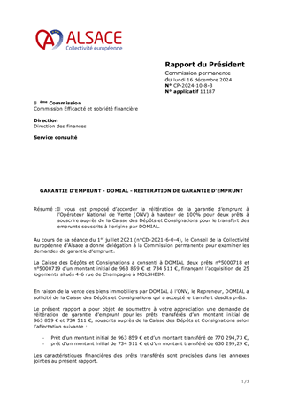 Il vous est proposé d’accorder la réitération de la garantie d’emprunt à l’Opérateur National de Vente (ONV) à hauteur de 100% pour deux prêts à souscrire auprès de la Caisse des Dépôts et Consignations pour le transfert des emprunts souscrits à l’origine par DOMIAL.