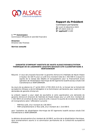 Il vous est proposé d’accorder la garantie d'emprunt à Habitats de Haute-Alsace à hauteur de 100 % pour un prêt d’un montant total de 1 352 000 € à souscrire auprès de la Caisse des Dépôts et Consignations pour le financement d'une opération de réhabilitation thermique de 65 logements locatifs sociaux situés Cité Clairefontaine à WINTZENHEIM.