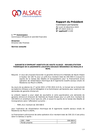 Il vous est proposé d’accorder la garantie d'emprunt à Habitats de Haute-Alsace à hauteur de 100 % pour un prêt d’un montant total de 330 000 € à souscrire auprès de la Caisse des Dépôts et Consignations pour le financement d'une opération de réhabilitation thermique de 8 logements locatifs sociaux situés 16 Résidence du Moulin à BUHL.