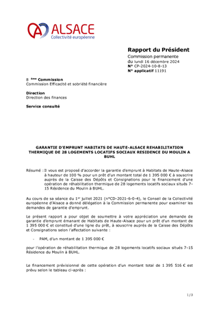 Il vous est proposé d’accorder la garantie d'emprunt à Habitats de Haute-Alsace à hauteur de 100 % pour un prêt d’un montant total de 1 395 000 € à souscrire auprès de la Caisse des Dépôts et Consignations pour le financement d'une opération de réhabilitation thermique de 28 logements locatifs sociaux situés 7-15 Résidence du Moulin à BUHL.
