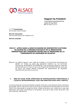 PDH 67 - APPUI DANS LA MISE EN OEUVRE DE DISPOSITIFS D'ACTIONS EN FAVEUR DE LA RÉHABILITATION ET DE LA RÉNOVATION ÉNERGÉTIQUE DES LOGEMENTS PRIVÉS SUR LE TERRITOIRE DE LA COMMUNAUTE DE COMMUNES DE SELESTAT