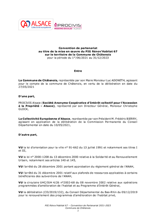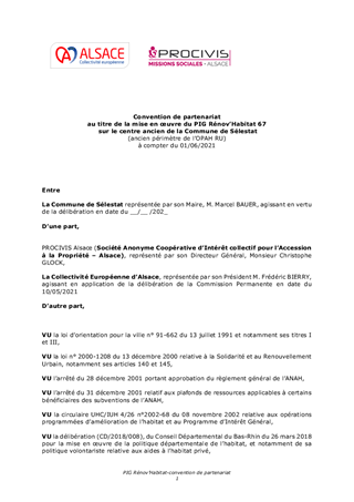 Le présent rapport a pour objet de proposer à la Commission Permanente de décider de mettre en place des dispositifs d'actions sur les territoires Communaux de SELESTAT et CHATENOIS. Il est proposé de mettre en place des partenariats pour la mise en œuvre du Programme d'Intérêt Général, ainsi que de lancer des études habitat préalables aux déploiements de dispositifs opérationnels ainsi que leurs suivis.