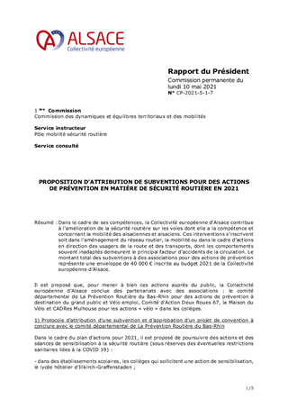 PROPOSITION D'ATTRIBUTION DE SUBVENTIONS POUR DES ACTIONS DE PRÉVENTION EN MATIÈRE DE SÉCURITÉ ROUTIÈRE EN 2021