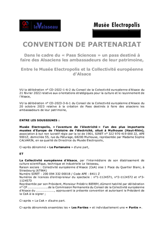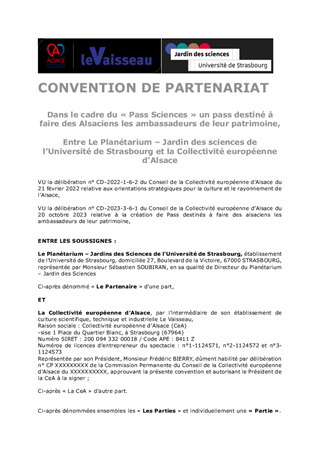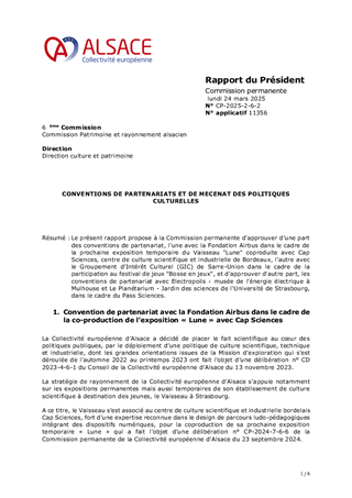 Le présent rapport propose à la Commission permanente d'approuver d'une part des conventions de partenariat, l'une avec la Fondation Airbus dans le cadre de la prochaine exposition temporaire du Vaisseau "Lune" coproduite avec Cap Sciences, centre de culture scientifique et industrielle de Bordeaux, l'autre avec le Groupement d'Intérêt Culturel (GIC) de Sarre-Union dans le cadre de la participation au festival de jeux "Bosse en jeux", et d'approuver d'autre part, les conventions de partenariat avec Electropolis - musée de l'énergie électrique à Mulhouse et Le Planétarium - Jardin des sciences de l'Université de Strasbourg, dans le cadre du Pass Sciences.