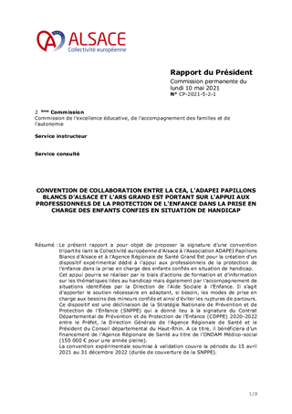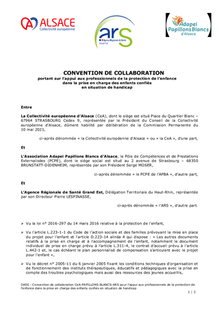 CONVENTION DE COLLABORATION ENTRE LA CEA, L'ADAPEI PAPILLONS BLANCS D'ALSACE ET L'ARS GRAND EST PORTANT SUR L'APPUI AUX PROFESSIONNELS DE LA PROTECTION DE L'ENFANCE DANS LA PRISE EN CHARGE DES ENFANTS CONFIES EN SITUATION DE HANDICAP