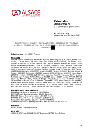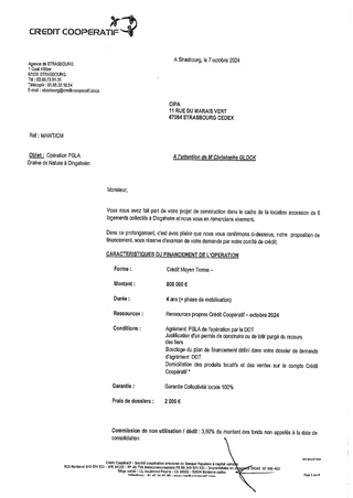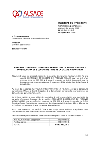 Il vous est proposé d’accorder la garantie d'emprunt à hauteur de 100 % à la société COMPAGNIE IMMOBILIERE DE PROCIVIS ALSACE pour un prêt d’un montant total de 800 000 € à souscrire auprès du Crédit Coopératif pour le financement de la construction de 6 logements PSLA situés Rue de la Chaîne à DINGSHEIM.