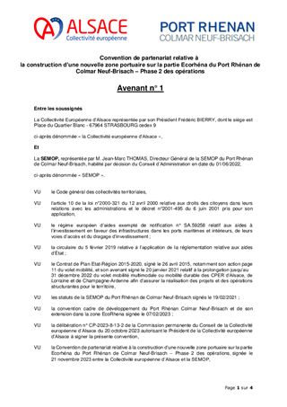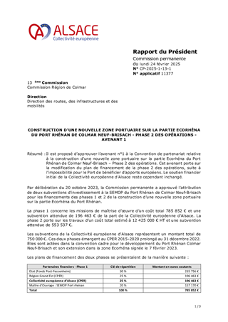 Il est proposé d’approuver l’avenant n°1 à la Convention de partenariat relative à la construction d’une nouvelle zone portuaire sur la partie Ecorhéna du Port Rhénan de Colmar Neuf-Brisach – Phase 2 des opérations. Cet avenant porte sur la modification du plan de financement de la phase 2 des opérations, suite à l’impossibilité pour le Port de bénéficier d’apports européens. Le soutien financier initial de la Collectivité européenne d’Alsace reste cependant inchangé.