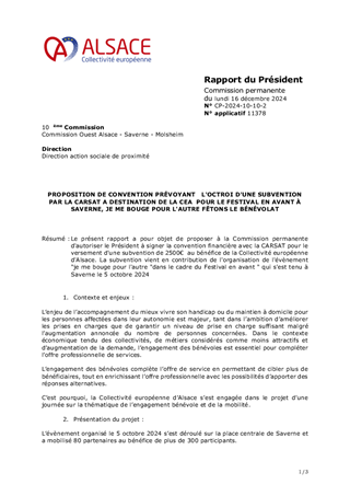 Le présent rapport a pour objet de proposer à la Commission permanente d'autoriser le Président à signer la convention financière avec la CARSAT pour le versement d'une subvention de 2500€ au bénéfice de la Collectivité européenne d'Alsace. La subvention vient en contribution de l'organisation de l'évènement "je me bouge pour l'autre "dans le cadre du Festival en avant " qui s'est tenu à Saverne le 5 octobre 2024