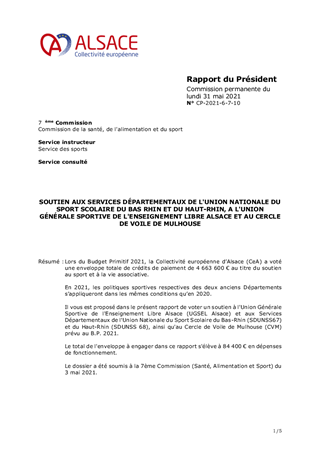 Lors du Budget Primitif 2021, la Collectivité européenne d’Alsace (CeA) a voté une enveloppe totale de crédits de paiement de 4 663 600 € au titre du soutien au sport et à la vie associative. En 2021, les politiques sportives respectives des deux anciens Départements s’appliqueront dans les mêmes conditions qu’en 2020. Il vous est proposé dans le présent rapport de voter un soutien à l'Union Générale Sportive de l'Enseignement Libre Alsace (UGSEL Alsace) et aux Services Départementaux de l'Union Nationale du Sport Scolaire du Bas-Rhin (SDUNSS67) et du Haut-Rhin (SDUNSS 68), ainsi qu'au Cercle de Voile de Mulhouse (CVM) prévu au B.P. 2021. Le total de l'enveloppe à engager dans ce rapport s'élève à 84 400 € en dépenses de fonctionnement. Le dossier a été soumis à la 7ème Commission (Santé, Alimentation et Sport) du 3 mai 2021.