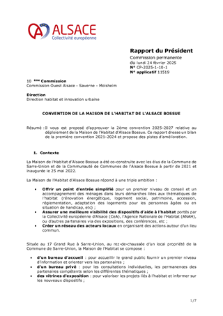 Il vous est proposé d'approuver la 2ème convention 2025-2027 relative au déploiement de la Maison de l'Habitat d'Alsace Bossue. Ce rapport dresse un bilan de la première convention 2021-2024 et propose des pistes d'amélioration.