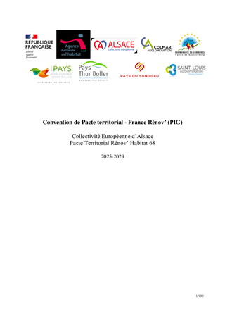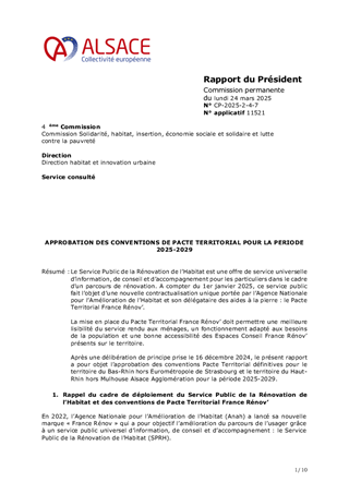 Le Service Public de la Rénovation de l’Habitat est une offre de service universelle d’information, de conseil et d’accompagnement pour les particuliers dans le cadre d’un parcours de rénovation. A compter du 1er janvier 2025, ce service public fait l’objet d’une nouvelle contractualisation unique portée par l’Agence Nationale pour l’Amélioration de l’Habitat et son délégataire des aides à la pierre : le Pacte Territorial France Rénov’. La mise en place du Pacte Territorial France Rénov’ doit permettre une meilleure lisibilité du service rendu aux ménages, un fonctionnement adapté aux besoins de la population et une bonne accessibilité des Espaces Conseil France Rénov’ présents sur le territoire. Après une délibération de principe prise le 16 décembre 2024, le présent rapport a pour objet l’approbation des conventions Pacte Territorial définitives pour le territoire du Bas-Rhin hors Eurométropole de Strasbourg et le territoire du Haut-Rhin hors Mulhouse Alsace Agglomération pour la période 2025-2029.